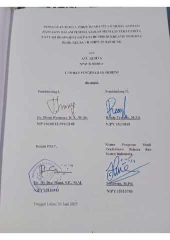Resita Ayu, 215030019 (2025) PENERAPAN MODEL PORPE BERBANTUAN MEDIA ANIMASI PLOTAGON DALAM PEMBELAJARAN MENULIS TEKS CERITA FANTASI BERORIENTASI PADA BERPIKIR KREATIF PESERTA DIDIK KELAS VII SMPN 35 BANDUNG. Skripsi(S1) thesis, FKIP UNPAS.