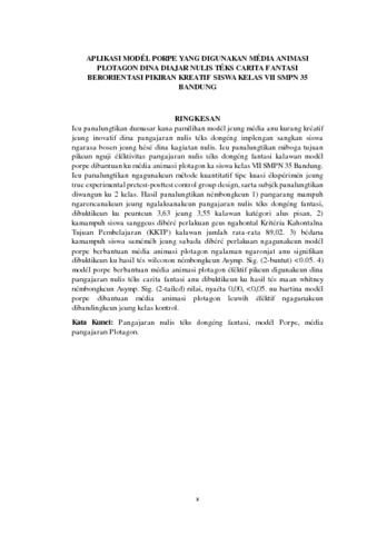 Penelitian ini didasari dari pemilihan model dan media yang kurang kreatif dan inovatif pada pembelajaran menulis teks cerita fantasi sehingga peserta didik merasa bosan dan sulit dalam kegiatan menulis. Penelitian ini bertujuan untuk menguji keefektifan pembelajaran menulis teks cerita fantasi dengan model porpe berbantuan media animasi plotagon pada peserta didik kelas VII SMPN 35 Bandung. Penelitian ini menggunakan metode kuantitatif jenis quansi eksperimen dan desain true eksperimental pretest-posttest control grup design, dan subjek penelitian terdiri dari 2 kelas. Hasil penelitian menunjukan 1) penulis mampu merencanakan dan melaksanakan pembelajaran menulis teks cerita fantasi, dibuktikan skor yang diperoleh sebesar 3,63 dan 3,55 dengan kategori sangat baik, 2) kemampuan peserta didik setelah mendapatkan perlakuan sudah mencapai Kriteria Ketercapaian Tujuan Pembelajaran (KKTP) dengan total rata-rata yang diperoleh sebesar 89,02. 3) perbedaan kemampuan peserta didik sebelum dan sesudah mendapatkan perlakuan menggunakan model porpe berbantuan media animasi plotagon mengalami peningkatan yang signifikan dengan dibuktikan hasil uji wilcoxon menunjukan nilai Asymp. Sig. (2-tailed) < 0,05. 4) model porpe berbantuan media animasi plotagon efektif digunakan pada pembelajaran menulis teks cerita fantasi dengan dibuktikan pemerolehan nilai uji maan whitney menunjukan nilai Asymp. Sig (2 tailed) yakni 0,00, < 0,05. yang artinya model porpe berbantuan media animasi plotagon lebih efektif digunakan dibandingkan dengan kelas kontrol. Kata kunci: Pembelajaran menulis teks cerita fantasi, model porpe, media pembelajaran plotagon.