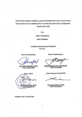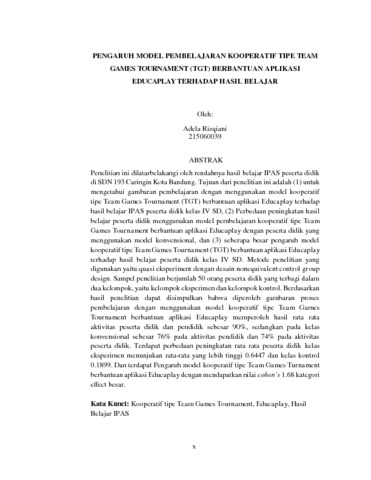 Rizqiani Adela, 215060039 (2025) PENGARUH MODEL PEMBELAJARAN KOOPERATIF TIPE TEAM GAMES TOURNAMENT (TGT) BERBANTUAN APLIKASI EDUCAPLAY TERHADAP HASIL BELAJAR (Penelitian Kuasi Eksperimen Pada kelas IV di Sekolah Dasar Pembelajaran IPAS). Skripsi(S1) thesis, FKIP UNPAS.