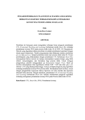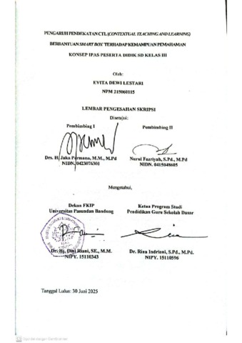 Lestari Evita Dewi, 215060115 (2025) PENGARUH PENDEKATAN CTL (CONTEXTUAL TEACHING AND LEARNING) BERBANTUAN SMART BOX TERHADAP KEMAMPUAN PEMAHAMAN KONSEP IPAS PESERTA DIDIK SD KELAS III. Skripsi(S1) thesis, FKIP UNPAS.