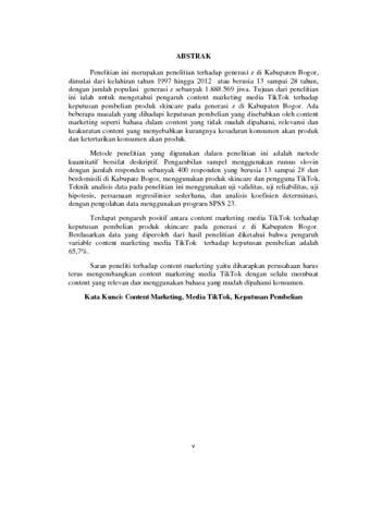Penelitian ini merupakan penelitian terhadap generasi z di Kabupaten Bogor, dimulai dari kelahiran tahun 1997 hingga 2012 atau berusia 13 sampai 28 tahun, dengan jumlah populasi generasi z sebanyak 1.888.569 jiwa. Tujuan dari penelitian ini ialah untuk mengetahui pengaruh content marketing media TikTok terhadap keputusan pembelian produk skincare pada generasi z di Kabupaten Bogor. Ada beberapa masalah yang dihadapi keputusan pembelian yang disebabkan oleh content marketing seperti bahasa dalam content yang tidak mudah dipahami, relevansi dan keakuratan content yang menyebabkan kurangnya kesadaran konsumen akan produk dan ketertarikan konsumen akan produk. Metode penelitian yang digunakan dalam penelitian ini adalah metode kuantitatif bersifat deskriptif. Pengambilan sampel menggunakan rumus slovin dengan jumlah responden sebanyak 400 responden yang berusia 13 sampai 28 dan berdomisili di Kabupate Bogor, menggunakan produk skincare dan pengguna TikTok. Teknik analisis data pada penelitian ini menggunakan uji validitas, uji reliabilitas, uji hipotesis, persamaan regresilinier sederhana, dan analisis koefisien determinasi, dengan pengolahan data menggunakan program SPSS 23. Terdapat pengaruh positif antara content marketing media TikTok terhadap keputusan pembelian produk skincare pada generasi z di Kabupaten Bogor. Berdasarkan data yang diperoleh dari hasil penelitian diketahui bahwa pengaruh variable content marketing media TikTok terhadap keputusan pembelian adalah 65,7%. Saran peneliti terhadap content marketing yaitu diharapkan perusahaan harus terus mengembangkan content marketing media TikTok dengan selalu membuat content yang relevan dan menggunakan bahasa yang mudah dipahami konsumen. Kata Kunci: Content Marketing, Media TikTok, Keputusan Pembelian