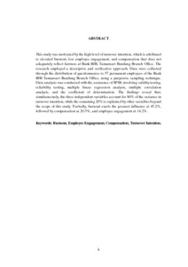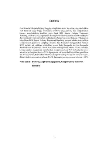 ABSTRAK Penelitian ini dilatarbelakangi tingginya tingkat turnover intention yang disebabkan oleh burnout yang tinggi, rendahnya employee engagement, dan compensation kurang merefleksikan keadilan pada Bank BJB Kantor Cabang Tamansari Bandung. Metode yang digunakan dalam penelitian ini adalah metode deskriptif dan verifikatif. Data diperoleh melalui penyebaran kuesioner kepada 57 karyawan tetap Bank BJB Kantor Cabang Tamansari Bandung, dengan teknik pengambilan sampel adalah purposive sampling. Analisis data dilakukan menggunakan bantuan SPSS melalui uji validitas, reliabilitas, regresi linier berganda, korelasi berganda, dan koefisien determinasi. Hasil penelitian menunjukkan bahwa secara simultan, ketiga variabel independen memberikan pengaruh sebesar 80% terhadap turnover intention, sedangkan sisanya 20% dipengaruhi oleh variabel lain di luar penelitian ini. Secara parsial, burnout memberikan pengaruh paling besar yaitu sebesar 45,2%, diikuti oleh compensation sebesar 20,5% dan employee engagement sebesar 14,2%. Kata Kunci: Burnout, Employee Engagement, Compensation, Turnover Intention