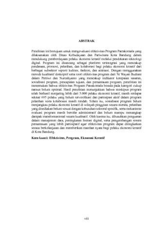 Fadlurohman, Riri (2025) EFEKTIVITAS PROGRAM PATRAKOMALA DIBIDANG EKONOMI KREATIF DINAS KEBUDAYAAN DAN PARIWISATA KOTA BANDUNG. Skripsi(S1) thesis, FISIP UNPAS.