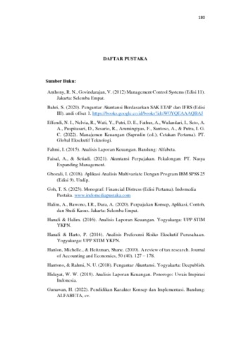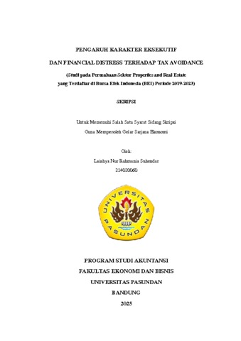 Laishya Nur Rahmania Suhendar, 214020060 and Drs.R.Muchamad Noch,M.AK.,AK.,CA., Pembimbing (2025) PENGARUH KARAKTER EKSEKUTIF DAN FINANCIAL DISTRESS TERHADAP TAX AVOIDANCE (Studi pada Perusahaan Sektor Properties and Real Estate yang Terdaftar di Bursa Efek Indonesia (BEI) Periode 2019-2023). Skripsi(S1) thesis, Universitas Pasundan Bandung.