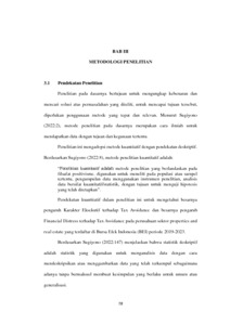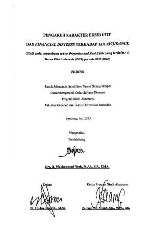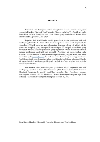 ABSTRAK Penelitian ini bertujuan untuk mengetahui secara empiris mengenai pengaruh Karakter Eksekutif dan Financial Distress terhadap Tax Avoidance pada Perusahaan Sektor Properties and Real Estate yang terdaftar di Bursa Efek Indonesia (BEI) periode 2019-2023. Populasi dari penelitian ini adalah perusahaan sektor properties and real estate yang terdaftar di Bursa Efek Indonesia periode 2019-2023 berjumlah 92 perusahaan. Teknik sampling yang digunakan dalam penelitian ini adalah teknik purposive sampling yang menghasilkan sebanyak 15 sampel perusahaan yang memenuhi kriteria. Metode penelitian yang digunakan adalah metode kuantitatif dengan pendekatan deskriptif dan asosiatif. Penelitian ini menggunakan data sekunder berupa laporan keuangan tahunan perusahaan, yang di akses pada situs resmi BEI yaitu www.idx.co.id dan website resmi dari masing-masing perusahaan. Analisis asosiatif yang digunakan dalam penelitian ini terdiri dari uji asumsi klasik, uji hipotesis (uji t), analisis regresi logistik, analisis koefisien korelasi, dan analisis koefisien determinasi. Berdasarkan hasil penelitian pada perusahaan sektor properties and real estate yang terdaftar di Bursa Efek Indonesia (BEI) Periode 2019-2023. Karakter Eksekutif berpengaruh positif signifikan terhadap Tax Avoidance dengan kemampuan sebesar 25,50%. Financial Distress berpengaruh negatif signifikan terhadap Tax Avoidance dengan kemampuan sebesar 10,15%.
