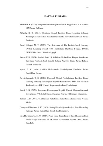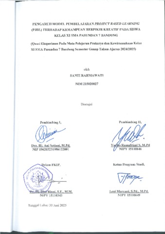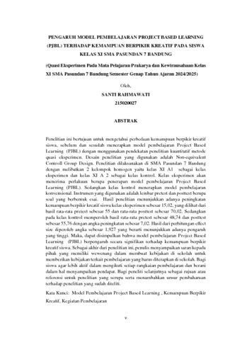 RAHMAWATI SANTI, 215020027 (2025) PENGARUH MODEL PEMBELAJARAN PROJECT BASED LEARNING (PJBL) TERHADAP KEMAMPUAN BERPIKIR KREATIF PADA SISWA KELAS XI SMA PASUNDAN 7 BANDUNG (Quasi Eksperimen Pada Mata Pelajaran Prakarya dan Kewirausahaan Kelas XI SMA Pasundan 7 Bandung Semester Genap Tahun Ajaran 2024/2025). Skripsi(S1) thesis, FKIP UNPAS.