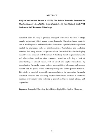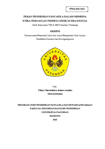 Azzahra Widya Chaerunnissa Januar, 215010004 (2025) PERAN PENDIDIKAN PANCASILA DALAM MEMBINA ETIKA PERGAULAN PESERTA DIDIK DI ERA DIGITAL (Studi Kasus kelas VIII di SMP Pasundan 3 Bandung). Skripsi(S1) thesis, FKIP UNPAS.