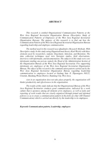 Penelitian ini berjudul Pola Komunikasi Organisasi Pada Biro Organisasi Sekretariat Daerah Jawa Barat (Studi Deskriptif Pola Komunikasi Karyawan Biro Organisasi Sekretariat Daerah Jawa Barat). Tujuan penelitian ini yaitu mengetahui bagaimana Pola Komunikasi Biro Organisasi Sekretariat Daerah Jawa Barat mengenai komunikasi pimpinan dan karyawan. Metode yang digunakan dalam penelitian ini menggunakan Metode Penelitian Kualitatif. Dengan studi Deskriptif. Pada penelitian ini menggunakan teori Perorganisasian (Karl Weick) dengan tiga elemen yang digunakan peneliti yaitu: Penentuan (Enactment), Pemilihan (Selection), dan Penyimpanan (Retention). Teknik pengumpulan data yang dilakukan adalah studi literatur, observasi lapangan, wawancara kepada informan, dan dokumentasi.Subjek pada penelitian ini yaitu informan inti berjumlah satu orang yaitu Kepala Bagian Tata Usaha Biro Organisasi Sekretariat Daerah Jawa Barat. Lima informan pendukung yaitu Karyawan Biro Organisasi Sekretariat Daerah Jawa Barat. Objek dari penelitian ini yaitu pola komunikasi yang dilakukan Biro Organisasi Sekretariat Daerah Jawa Barat mengenai komunikasi pimpinan kepada karyawan yang berlokasi di Gedung Sate Jl. Diponegoro NO.22, Citarum, Kecamatan Bandung Wetan, Kota Bandung, Jawa Barat. Komunikasi organisasi merupakan komunikasi yang berlangsung dalam sebuah organisasi, komunikasi didalam sebuah organisasi menjadi hal penting dikarenakan jika komunikasi didalam sebuah organisasi tidak berlangsung secara baik maka organisasi tersebut akan menghambat produktivitas dan efektivitas dalam organisasi tersebut. Hasil dari penelitian ini menunjukan bahwa Biro Organisasi Sekretariat Daerah Jawa Barat melakukan komunikasi yang baik, ditunjukan dengan budaya kerja yaitu keterbukaan diantara semua elemen karyawannya, serta tugas dan pelaporan hasil kerja yang sudah teratur dengan jelas melalui kebijakan formal dan informal sehingga memunculkan pola komunikasi berupa Bintang (All Channel Communication) yang dilaksanakan secara langsung oleh pimpinan kepada karyawannya. Kata Kunci: Pola Komunikasi, Pimpinan, Karyawan
