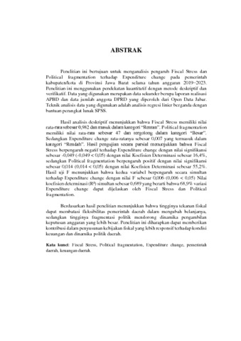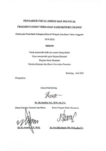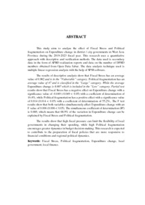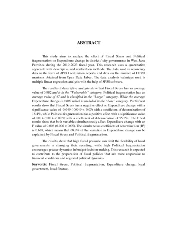 ABSTRAK Penelitian ini bertujuan untuk menganalisis pengaruh Fiscal Stress dan Political fragmentation terhadap Expenditure change pada pemerintah kabupaten/kota di Provinsi Jawa Barat selama tahun anggaran 2019–2023. Penelitian ini menggunakan pendekatan kuantitatif dengan metode deskriptif dan verifikatif. Data yang digunakan merupakan data sekunder berupa laporan realisasi APBD dan data jumlah anggota DPRD yang diperoleh dari Open Data Jabar. Teknik analisis data yang digunakan adalah analisis regresi linier berganda dengan bantuan perangkat lunak SPSS. Hasil analisis deskriptif menunjukkan bahwa Fiscal Stress memiliki nilai rata-rata sebesar 0,982 dan masuk dalam kategori “Rentan”. Political fragmentation memiliki nilai rata-rata sebesar 47 dan tergolong dalam kategori “Besar”. Sedangkan Expenditure change rata-ratanya sebesar 0,007 yang termasuk dalam kategori “Rendah”. Hasil pengujian secara parsial menunjukkan bahwa Fiscal Stress berpengaruh negatif terhadap Expenditure change dengan nilai signifikansi sebesar -0,049 (-0,049 < 0,05) dengan nilai Koefisien Determinasi sebesar 16,4%, sedangkan Political fragmentation berpengaruh positif dengan nilai signifikansi sebesar 0,014 (0,014 < 0,05) dengan nilai Koefisien Determinasi sebesar 55,2%. Hasil uji F menunjukkan bahwa kedua variabel berpengaruh secara simultan terhadap Expenditure change dengan nilai F sebesar 0,006 (0,006 < 0,05) Nilai koefisien determinasi (R²) simultan sebesar 0,689 yang berarti bahwa 68,9% variasi Expenditure change dapat dijelaskan oleh Fiscal Stress dan Political fragmentation. Berdasarkan hasil penelitian menunjukkan bahwa tingginya tekanan fiskal dapat membatasi fleksibilitas pemerintah daerah dalam mengubah belanjanya, sedangkan tingginya fragmentasi politik mendorong dinamika pengambilan keputusan anggaran yang lebih besar. Penelitian ini diharapkan dapat memberikan kontribusi dalam penyusunan kebijakan fiskal yang lebih responsif terhadap kondisi keuangan dan dinamika politik daerah. Kata kunci: Fiscal Stress, Political fragmentation, Expenditure change, pemerintah daerah, keuangan daerah.