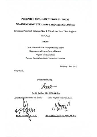 Nabila Haifa Khoirunnisa, 214020093 and Dr. Ifa Ratifah, SE.,MSi,AK,CA, Pembimbing (2025) PENGARUH FISCAL STRESS DAN POLITICAL FRAGMENTATION TERHADAP EXPENDITURE CHANGE (Studi pada Pemerintah Kabupaten/Kota di Wilayah Jawa Barat Tahun Anggaran 2019-2023). Skripsi(S1) thesis, Universitas Pasundan Bandung.