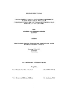 Penelitian ini berjudul “Presentasi Diri Anggota Organisasi Masyarakat di Dalam Media Sosial Instagram: Studi Deskriptif Kualitatif pada Anggota Organisasi Masyarakat XTC Ciwastra”. Fokus penelitian ini adalah untuk mengetahui bagaimana anggota organisasi masyarakat XTC Ciwastra menampilkan diri di media sosial Instagram, baik dari kalangan dewasa maupun pelajar (IPXC). Permasalahan yang diangkat berkaitan dengan strategi presentasi diri, pola komunikasi, serta perbedaan cara membangun citra diri di ruang virtual antara kedua kelompok anggota tersebut. Penelitian ini menggunakan pendekatan deskriptif kualitatif, dengan teknik pengumpulan data berupa wawancara mendalam, observasi, serta dokumentasi terhadap akun Instagram para informan. Teori yang digunakan adalah teori dramaturgi Erving Goffman, yang membedakan panggung depan (front stage) dan panggung belakang (back stage) dalam proses presentasi diri. Teori ini membantu peneliti memahami bagaimana anggota XTC Ciwastra mengelola kesan dan membangun identitas di hadapan publik melalui Instagram. Kata Kunci: Dramaturgi, Organisasi Masyarakat, Presentasi Diri, XTC Ciwastra