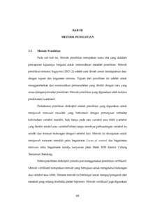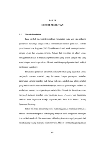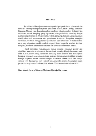 ABSTRAK Penelitian ini bertujuan untuk mengetahui pengaruh locus of control dan motivasi terhadap kinerja karyawan pada Bank BJB Kantor Cabang Tamansari Bandung. Metode yang digunakan dalam penelitian ini yaitu analisis deskriptif dan verifikatif, teknik sampling yang digunakan yaitu probability sampling dengan jumlah sampel sebanyak 57 responden. Teknik pengumpulan data yang digunakan adalah observasi, wawancara, dan penyebaran kuesioner. Pengujian pengujian instrumen penelitian menggunakan uji validitas, dan reliabilitas. Metode analisis data yang digunakan adalah analisis regresi linier berganda, analisis korelasi berganda, koefisien determinasi simultan dan koefisien determinasi parsial. Hasil penelitian menunjukkan bahwa terdapat pengaruh positif dan signifikan antara locus of control dan motivasi terhadap kinerja karyawan pada Bank BJB Kantor Cabang Tamansari Bandung. Hasil analisis data menunjukan besarnya pengaruh locus of control dan motivasi berpengaruh signifikan terhadap kinerja karyawan secara simultan dengan kontribusi sebesar 84% dan sisanya sebesar 16% dipengaruhi oleh variabel lain yang tidak diteliti. Sedangkan secara parsial, locus of control berkontribusi sebesar 22% dan motivasi sebesar 62%. Kata kunci: Locus of Control, Motivasi, Kinerja Karyawan