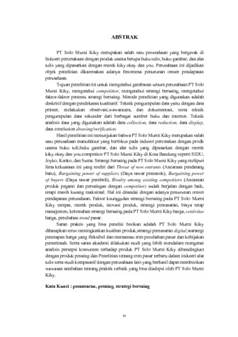 PT Solo Murni Kiky merupakan salah satu perusahaan yang bergerak di Industri percetakaan dengan produk utama berupa buku tulis, buku gambar, dan alat tulis yang dipasarkan dengan merek kiky.okay dan you. Perusahaan ini dijadikan objek penelitian dikarenakan adanya fenomena penurunan omset pendapatan perusahaan. Tujuan penelitian ini untuk mengetahui gambaran umum perusahaan PT Solo Murni Kiky, mengetahui competitior, mengetahui strategi bersaing, mengetahui faktor-faktor penentu strategi bersaing. Metode penelitian yang digunakan adalah deskritif dengan pendekatan kualitatif. Teknik pengumpulan data yaitu dengan data primer, melakukan observasi,wawancara, dan dokumentasi, serta teknik pengumpulan data sekunder dari berbagai sumber buku dan internet. Teknik analisis data yang digunakan adalah data collection, data reduction, data display, data conclusion drawing/verification. Hasil penelitian ini menunjukan bahwa PT Solo Murni Kiky merupakan salah satu perusahaan manufaktur yang berfokus pada industri percetakan dengan prodk utama buku tuli,buku gambar, dan alat tulis yang dipasarkan dengan merek kiky.okay dan you.competitor PT Solo Murni Kiky di Kota Bandung seperti SIDU, Joyko, Kenko, dan Suma. Strategi bersaing pada PT Solo Murni Kiky yang meliputi lima kekuataan ini yang terdiri dari Threat of new entrants (Ancaman pendatang baru), Bargaining power of suppliers (Daya tawar pemasok), Bargaining power of buyers (Daya tawar pembeli), Rivalry among existing competitors (Ancaman produk peganti dan persaingan dengan competitor) sudah berjalan dengan baik, tetapi masih kurang maksimal. Hal ini ditandai dengan adanya penurunan omset pendapatan perusahaan. Faktor keunggulan strategi bersaing pada PT Solo Murni Kiky tempat, merek produk, inovasi produk, strategi pemasaran, biaya tetap manajemen, kelemahan strategi bersaing pada PT Solo Murni Kiky harga, sentivitas harga, perubahan trend pasar. Saran praktis yang bisa peneliti berikan adalah PT Solo Murni Kiky diharapkan terus meningkatkan kualitas produk,strategi pemasaran digital,starategi penetapan harga yang fleksibel dan memantau tren perubahan pasar dan kebijakan pemerintah. Serta saran akademi dilakukan studi yang lebih mendalam mengenai analisis persepsi konsumen terhadap produk PT Solo Murni Kiky dibandingkan dengan produk pesaing dan Penelitian tentang tren pasar terbaru dalam industri alat tulis serta studi komparatif dengan perusahaan lain yang berhasil dapat memberikan wawasan tambahan tentang praktik terbaik yang bisa diadopsi oleh PT Solo Murni Kiky. Kata Kunci : pemasaran, pesaing, strategi bersaing