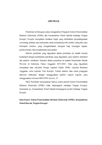 ABSTRAK Penelitian ini bertujuan untuk menganalisis Pengaruh Sistem Pemerintahan Berbasis Elektronik (SPBE) dan Kemandirian Fiskal Daerah terhadap Tingkat Korupsi. Korupsi merupakan tindakan ilegal yang melibatkan penyalahgunaan wewenang, jabatan, atau kekuasaan untuk memperkaya diri sendiri, orang lain, atau kelompok tertentu, yang mengakibatkan kerugian bagi keuangan negara, perekonomian, dan kesejahteraan masyarakat. Metode penelitian yang digunakan dalam penelitian ini adalah metode kuantitatif dengan pendekatan penelitian yang digunakan yaitu analisis deskriptif dan analisis verifikatif. Populasi dalam penelitian ini adalah Pemerintah Daerah Provinsi di Indonesia Tahun Anggaran 2019-2023. Data yang digunakan merupakan data sekunder berupa Laporan Indeks SPBE, Laporan Realisasi Anggaran, serta Laporan Tren Korupsi. Teknik analisis data untuk pengujian hipotesis dilakukan dengan menggunakan analisis regresi logistik yaitu menggunakan software IBM SPSS Statistic 25. Hasil Penelitian menunjukkan bahwa secara parsial Sistem Pemerintahan Berbasis Elektronik (SPBE) tidak berpengaruh terhadap Tingkat Korupsi. Sementara itu, Kemandirian Fiskal Daerah berpengaruh positif terhadap Tingkat Korupsi. Kata Kunci: Sistem Pemerintahan Berbasis Elektronik (SPBE), Kemandirian Fiskal Daerah, Tingkat Korupsi
