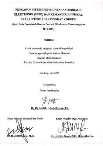 Aidapyani Aulianurrahmah, 214020087 and Dr. Ifa Ratifah, SE.,MSi,AK,CA, Pembimbing (2025) PENGARUH SISTEM PEMERINTAHAN BERBASIS ELEKTRONIK (SPBE) DAN KEMANDIRIAN FISKAL DAERAH TERHADAP TINGKAT KORUPSI (Studi Pada Pemerintah Daerah Provinsi di Indonesia Tahun Anggaran 2019-2023). Skripsi(S1) thesis, Universitas Pasundan Bandung.