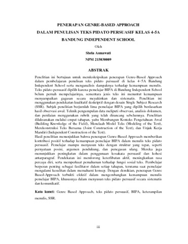Asmarawati Shela, 215030009 (2025) PENERAPAN GENRE-BASED APPROACH DALAM PENULISAN TEKS PIDATO PERSUASIF KELAS 4-5A BANDUNG INDEPENDENT SCHOOL. Skripsi(S1) thesis, FKIP UNPAS.