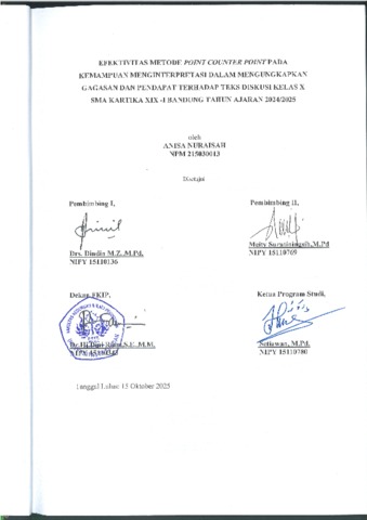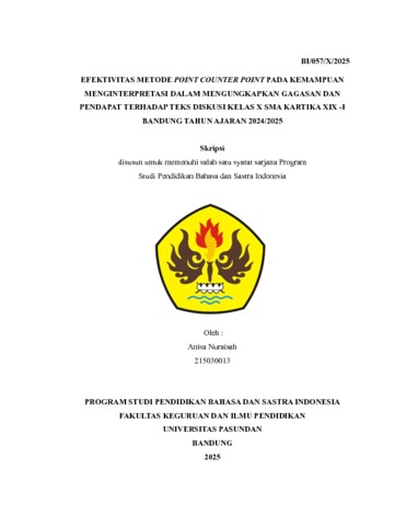 Nuraisah Anisa, 215030013 (2025) EFEKTIVITAS METODE POINT COUNTER POINT PADA KEMAMPUAN MENGINTERPRETASI DALAM MENGUNGKAPKAN GAGASAN DAN PENDAPAT TERHADAP TEKS DISKUSI KELAS X SMA KARTIKA XIX -I BANDUNG TAHUN AJARAN 2024/2025. Skripsi(S1) thesis, FKIP UNPAS.