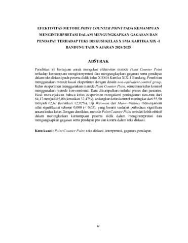 Penelitian ini bertujuan untuk mengukur efektivitas metode Point Counter Point terhadap kemampuan menginterpretasi dan mengungkapkan gagasan serta pendapat dalam teks diskusi pada peserta didik kelas X SMA Kartika XIX-1 Bandung. Penelitian menggunakan metode kuasi eksperimen dengan desain non-equivalent control group. Kelas eksperimen menggunakan metode Point Counter Point, sementara kelas kontrol menggunakan metode konvensional. Data dikumpulkan melalui prates dan pascates. Hasil menunjukkan bahwa kelas eksperimen mengalami peningkatan rata-rata dari 64,17 menjadi 85,00 (kenaikan 32,47%), sedangkan kelas kontrol meningkat dari 55,50 menjadi 62,67 (kenaikan 12,92%). Uji Wilcoxon dan Mann–Whitney menunjukkan nilai signifikansi sebesar 0,000 (< 0,05), yang berarti terdapat perbedaan signifikan antara kedua kelas.Dengan demikian, metode Point Counter Point terbukti lebih efektif dalam meningkatkan kemampuan peserta didik dalam menginterpretasi dan mengungkapkan gagasan serta pendapat pro dan kontra dalam teks diskusi. Kata kunci: Point Counter Point, teks diskusi, interpretasi, gagasan, pendapat.