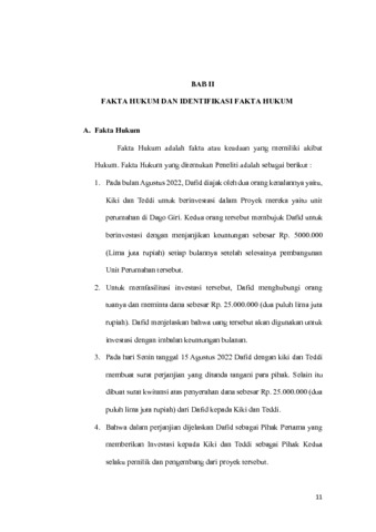 Penelitian ini dilatarbelakangi oleh meningkatnya kasus penipuan dan penggelapan bermodus investasi bodong di masyarakat, yang seringkali dikemas dalam bentuk perjanjian formal untuk menimbulkan kesan legal dan meyakinkan. Salah satu contohnya adalah kasus yang dialami oleh Dafid, seorang korban yang diminta oleh dua individu, Kiki dan Teddi, untuk menanamkan modal sebesar Rp25.000.000 pada proyek pembangunan unit perumahan yang diklaim berada di kawasan Dago Giri. Kiki dan Teddi menjanjikan imbal hasil tetap sebesar Rp5.000.000 per bulan setelah proyek berjalan. Namun setelah empat bulan, keuntungan yang dijanjikan tidak kunjung diberikan, dan Dafid tidak lagi dapat menghubungi para pelaku. Ketika Dafid melakukan pengecekan ke lokasi proyek, ternyata proyek tersebut tidak berjalan dan tidak dimiliki oleh Kiki dan Teddi. Penelitian ini bertujuan untuk mengkaji tindakan hukum yang dapat ditempuh oleh korban penipuan dan penggelapan investasi proyek fiktif yang dibungkus dalam bentuk perjanjian. Dalam menganalisis kasus ini, peneliti menggunakan alat analisis yaitu metode interpretasi hukum, khususnya pendekatan gramatikal dan sistematis terhadap unsur-unsur delik dalam Pasal 372 dan Pasal 378 Kitab Undang-Undang Hukum Pidana (KUHP). Pasal 372 KUHP mengatur tentang tindak pidana penggelapan, sedangkan Pasal 378 KUHP mengatur mengenai penipuan. Penelitian berpedoman pada Teori Perlindungan Hukum menurut Philipus M. Hadjon (1987) dalam bukunya yang berjudul Perlindungan Hukum Bagi Rakyat Indonesia menjelaskan jaminan yang diberikan kepada semua pihak untuk dapat melaksanakan hak dan kepentingan hukum yang dimilikinya dalam kapasitas sebagai subjek hukum. Hasil penelitian menunjukkan bahwa seluruh unsur delik baik dalam Pasal 372 KUHP maupun Pasal 378 KUHP telah terpenuhi secara kumulatif. Unsur subjektif berupa niat untuk menguntungkan diri sendiri secara melawan hukum terbukti dari janji investasi fiktif yang dikemas dalam bentuk formal. Unsur objektif terbukti dari adanya perbuatan membujuk korban untuk menyerahkan uang dengan tipu muslihat dan rangkaian kebohongan. Selain itu, penguasaan dana oleh pelaku yang awalnya sah namun kemudian disalahgunakan, memenuhi unsur penggelapan. Dengan demikian, Dafid memiliki dasar hukum yang kuat untuk menempuh upaya hukum pidana melalui pelaporan ke SPKT Polsek atau Polres di wilayah tempat kejadian. Di samping itu, upaya perdata juga dapat ditempuh melalui gugatan ganti rugi berdasarkan Pasal 1365 KUHPerdata. Kata Kunci: Penipuan, Penggelapan, Perjanjian Investasi, Upaya Hukum