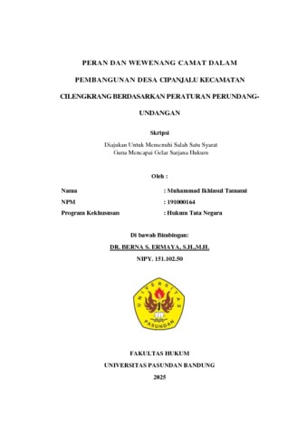 Muhammad Ikhlasul Tamami, Muhammad Ikhlasul Tamami (2025) PERAN DAN WEWENANG CAMAT DALAM PEMBANGUNAN DESA CIPANJALU KECAMATAN CILENGKRANG BERDASARKAN PERATURAN PERUNDANGUNDANGAN. Skripsi(S1) thesis, FAKULTAS HUKUM UNIVERSITAS PASUNDAN.