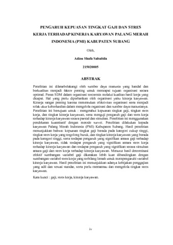SALSABILA,ADIEN SHAFA, 215020005 (2025) PENGARUH KEPUASAN TINGKAT GAJI DAN STRES KERJA TERHADAP KINERJA KARYAWAN PALANG MERAH INDONESIA (PMI) KABUPATEN SUBANG. Skripsi(S1) thesis, FKIP UNPAS.