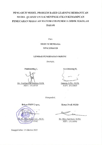 SUHENDAKA HEDY, 215060028 (2025) PENGARUH MODEL PROBLEM BASED LEARNING BERBANTUAN MEDIA QUIZIZZ UNTUK MENINGKATKAN KEMAMPUAN PEMECAHAN MASALAH MATEMATIS PESERTA DIDIK SEKOLAH DASAR. Skripsi(S1) thesis, FKIP UNPAS.