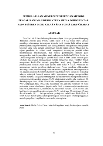 Penelitian ini di latar belakangi karena terdapat beberapa permasalahan yang ditemukan peneliti pada Peserta Didik Kelas X SMA Tunas Baru Ciparay rendahnya diantaranya kemampuan menulis puisi peserta didik akibat metode pembelajaran yang konvensional dan kurang menarik serta pendidik menghadapi kesulitan yang sama dengan kemampuan menulis secara umum. Maka dari itu, tujuan penelitian ini adalah untuk mengetahui kemampuan peneliti dalam merencanakan, melaksanakan, dan menilai pembelajaran menulis puisi menggunakan metode pengaliran imaji pada peserta didi kelas X SMA. Selain itu, Untuk mengetahui kemampuan peserta didik kelas X SMA dalam menulis puisi sebelum dan sesudah menggunakan metode pengaliran imaji. Terakhir, Untuk mengatahui keefektifan metode pengaliran imaji yang digunakan dalam pembelajaran menulis puisi pada peserta didik kelas X SMA. Penelitian ini menerapkan metode penelitian tindakan kelas. Proses penelitian dilaksanakan dalam tiga siklus, di mana setiap siklus terdiri dari dua pertemuan. Dalam penelitian ini, digunakan desain Kelompok Kontrol yang Tidak Setara. Desain ini mencakup adanya kelompok kontrol, namun tidak sepenuhnya mampu mengendalikan variabel eksternal yang dapat memengaruhi hasil eksperimen. Hasil penelitian Hasil pretes menunjukkan skor rata-rata 53,71, nilai maksimum 80, nilai minimum 30, dan simpangan baku 14,108. Di sisi lain, hasil postes menunjukkan skor rata-rata 93,14, simpangan baku 6,652, nilai maksimum 100, dan nilai minimum 80. Hasil pretes dan postes kelas kontrol juga tersedia. Hasil pretes menunjukkan skor ratarata 50,71, maksimum 75, minimum 30, dan deviasi standar 12,316. Di sisi lain, hasil postes menunjukkan skor rata-rata 66,71, maksimum 90, minimum 45, dan deviasi standar 11,111. Artinya terdapat peningkatan pada Peserta Didik Kelas X SMA Tunas Baru Ciparay dalam pembelajaran menulis puisi setelah penggunaan metode pengaliran imaji berbantuan media pohon pintar. Kata Kunci: Media Pohon Pintar, Metode Pengaliran Imaji, Pembelajaran menulis puisi.