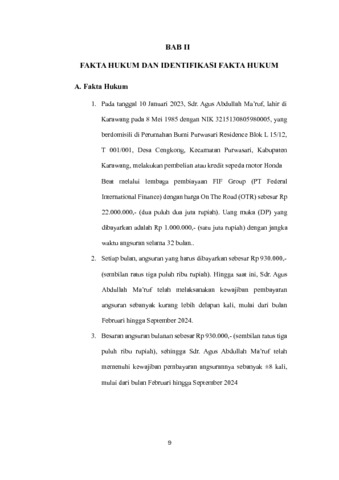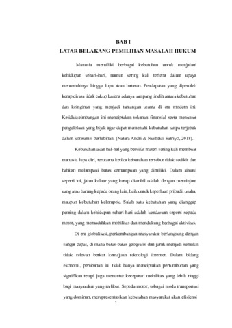 Kebutuhan akan mobilitas yang mendesak membuat masyarakat terdorong untuk memiliki kendaraan pribadi guna menunjang aktivitas sehari-hari. Di sisi lain, dealer kendaraan juga berusaha menjual produk mereka dengan berbagai strategi, seperti program cicilan, untuk menarik pembeli sekaligus meningkatkan keuntungan. Hal ini menciptakan situasi di mana sepeda motor menjadi barang yang diidamkan banyak orang, meski membutuhkan pengorbanan finansial. Penyalahgunaan dalam praktik jual beli sepeda motor, terutama yang menjadi objek perjanjian gadai, mencerminkan tantangan besar dalam pengelolaan keuangan serta pemahaman masyarakat terhadap hak dan kewajiban hukum. Dengan meningkatkan kesadaran akan dampak hukum dan risiko finansial, masyarakat dapat menjaga integritas dalam transaksi jual beli sepeda motor, sekaligus melindungi semua pihak yang terlibat dari kerugian. Secara hukum, praktik menjual sepeda motor yang menjadi objek perjanjian gadai tanpa seizin pihak pemberi gadai dapat dikategorikan sebagai tindak pidana penggelapan. Dalam penulisan momerandum hukum ini, alat analisis yang diterapkan adalah penafsiran hukum atau interpretasi, metode pendekatan pada penemuan hukum untuk memahami makna yang terkandung dalam teks undang-undang untuk dipakai dalam menyelesaikan kasus atau mengambil suatu keputusan atas peristiwa yang sedang dihadapi secara konkret. Penulisan ini menitikberatkan kepada Kitab Undang-undang Hukum Perdata. Metode interpretasi yang digunakan adalah Interpretasi gramatikal yang memberikan makna terhadap suatu aturan hukum melalui penalaran hukum untuk diterapkan terhadap teks yang kabur atau kurang jelas, dan interpretasi sistematis merupakan yang mengaitkan peraturan perundangan-undangan dengan peraturan hukum lainnya agar menjadi kesatuan sistem yang utuh. Upaya hukum yang dapat dilakukan oleh korban terhadap kasus penggelapan motor di Desa Cengkong,Kecamatan Purwasari,Kabupaten Karawang yaitu ada beberapa cara yakni dengan melaporkan tindak pidana penggelapan dan juga tindak pidana penadahan kepada pihak kepolisian dengan disertai bukti-bukti yang kuat dan juga dapat menempuh upaya mediasi. Akibat hukum dari perbuatan menjual motor tanpa izin berdasarkan perspektif hukum pidana yakni dapat dikenakan sanksi pidana menggunakan ketentuan yang ada dalam Pasal 372 KUHP tentang tindak pidana penggelapan dan juga dapat dikenakan sanksi pidana berdasarkan Pasal 480 KUHP mengenai tindak pidana penadahan. Kata Kunci: Tindak Pidana, Penggelapan, Upaya Hukum.