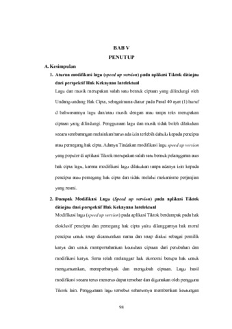 Tiktok sebagai media sosial yang memuat konten audio dan visual menjadi sarana yang efektif untuk menyebarkan lagu, hal ini didukung oleh fitur Tiktok salah satunya fitur use sound. Fitur tersebut menimbulkan celah terjadinya pelanggaran hak cipta, karena banyak lagu yang diunggah di Tiktok merupakan hasil modifikasi tanpa izin oleh pengguna Tiktok. Melalui fitur tersebut, lagu hasil modifikasi dapat dengan mudah tesebarluaskan. Salah satu bentuk modifikasi yang populer adalah speed up version. Tren modifikasi lagu speed up version bertentangan dengan peraturan perundang-undangan yang mengakui lagu dan musik sebagai objek yang dilindungi. Modifikasi lagu tidak memperhatikan identitas pencipta lagu asli, dan berpotensi merugikan hak ekonomi pencipta dan pemegang hak cipta. Dari hal tersebut, maka perlu dikaji mengenai bagaimana aturan modifikasi lagu (speed up version) pada aplikasi Tiktok ditinjau dari perspektif Hak Kekayaan Intelektual, bagaimana dampak modifikasi lagu (speed up version) pada aplikasi Tiktok ditinjau dari perspektif Hak Kekayaan Intelektual, serta bagaimana penyelesaian permasalahan atas modifikasi lagu (speed up version) pada aplikasi Tiktok ditinjau dari perspektif Hak Kekayaan Intelektual. Penelitian ini bersifat deskriptif analitis yaitu memberikan gambaran secara terstruktur mengenai permasalahan hukum yang menjadi fokus penelitian. Metode pendekatan yang digunakan adalah yuridis normatif yaitu mengkaji peraturan dan literatur yang relevan dengan permasalah yang diteliti. Penelitian dilakukan melalui dua tahap yakni penelitian kepustakaan dengan mengumpulkan sumber dari bahan-bahan hukum terkait (primer, sekunder, tersier) dan penelitian lapangan. Teknik pengumpulan data dilakukan dengan studi dokumen dan lapangan. Analisis data menggunakan metode yuridis-kualitatif. Hasil penelitian menunjukan bahwa modifikasi lagu menjadi bentuk speed up version pada aplikasi Tiktok tanpa adanya izin baik kepada pencipta atau pemegang hak cipta merupakan pelanggaran atas hak cipta lagu, sebagaimana diatur dalam Pasal 40 ayat (1) huruf d Undang-undang Hak Cipta bahwa lagu dan/atau musik dengan atau tanpa teks adalah ciptaan yang dilindungi. Modifikasi lagu berdampak pada hak eksklusif pencipta dan pemegang hak cipta yaitu dilanggarnya hak moral dan hak ekonomi. Pencipta dan Pemegang hak cipta yang merasa dirugikan atas tindakan ini dapat menempuh upaya hukum melalui jalur litigasi ataupun non-litigasi. Kata kunci: Hak Cipta, Modifikasi Lagu, Tiktok
