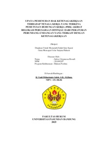 Salwa Gityanessa Rosadi, Salwa Gityanessa Rosadi (2025) UPAYA PEMENUHAN HAK KETENAGAKERJAAN TERHADAP TENAGA KERJA YANG TERKENA PEMUTUSAN HUBUNGAN KERJA (PHK) AKIBAT RELOKASI PERUSAHAAN DITINJAU DARI PERATURAN PERUNDANG-UNDANGAN YANG TERKAIT DENGAN KETENAGAKERJAAN. Skripsi(S1) thesis, FAKULTAS HUKUM UNIVERSITAS PASUNDAN.