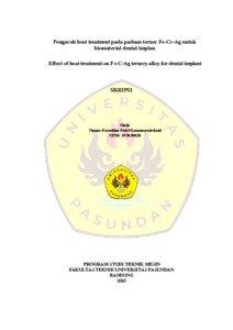 Putri Kusumawardani, Faradina (2025) Pengaruh heat treatment pada paduan terner Fe-Cr-Ag untuk biomaterial dental implan. Skripsi(S1) thesis, Fakultas Teknik Unpas.