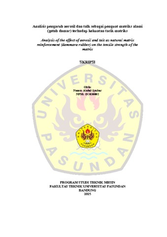 Syukur, Abdul (2025) Analisis pengaruh aerosil dan talk sebagai penguat matriks alami (getah damar) terhadap kekuatan tarik matriks. Skripsi(S1) thesis, Fakultas Teknik Unpas.