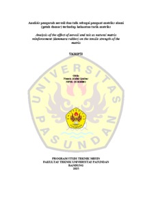 Penelitian ini bertujuan untuk menganalisis pengaruh penambahan bahan penguat partikel berupa aerosil dan talk terhadap sifat tarik dari komposit berbasis matriks alami getah damar. Getah damar merupakan polimer alami yang memiliki keunggulan dari sisi keberlanjutan dan ketersediaan, tetapi sifat getasnya menjadi kendala utama dalam penggunaannya sebagai matriks. Untuk mengatasi hal tersebut, dilakukan upaya optimalisasi matriks melalui pencampuran dengan resin polyester. Tiga variasi perbandingan komposisi antara getah damar dengan resin polyester, yaitu: (1:1, 2:3, 2:1) diuji untuk menentukan komposisi yang paling stablil secara mekanik. Hasil terbaik diperoleh pada perbandingan 2:1 (resin polyester:getah damar), dan komposisi ini digunakan sebagai dasar formulasi untuk spesimen uji tarik. Tiga variasi komposisi spesimen dibuat: spesimen A (getah damar dan resin polyester perbandingan 1:2), spesimen B (komposisi A dengan penambahan aerosil 5 gram dan talk 45 gram), serta spesimen C (komposisi A dengan penambahan talk 90 gram). Setiap variasi komposisi dibuat tiga spesimen. Pengujian tarik dilakukan sesuai dengan standar ASTM D638 untuk memperoleh nilai kekuatan tarik dan modulus elastisitas. Hasil menunjukan bahwa penambahan kombinasi partikel penguat meningkatkan sifat mekanik komposit secara signifikan. Spesimen B menunjukan kekuatan tarik tertinggi dengan nilai rata-rata sebesar 11,83 MPa, sedangkan spesimen C memiliki nilai rata-rata modulus elastisitas tertinggi sebesar 3314,127 MPa. spesimen A menunjukan performa terendah karena tidak mengandung penguat. Kesimpulan dari penelitian ini adalah bahawa penggunaan kombinasi aerosil dan talk dalam proporsi seimbang mampu memberikan peningkatan optimal terhadap kekuatan dan kekakuan material. Formulasi spesimen B dinilai paling efektif dari segi performa mekanik, serta menunjukan potensi pemanfaatan matriks alami yang dimodifikasi dalam aplikasi komposit berkelanjutan. Kata kunci: getah damar, matriks alami, komposit, aerosil, talk, ASTM D638, kekuatan tarik, modulus elastisitas.