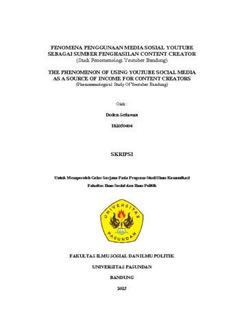 Setiawan, Deden (2025) FENOMENA PENGGUNAAN MEDIA SOSIAL YOUTUBE SEBAGAI SUMBER PENGHASILAN CONTENT CREATOR (Studi Fenomenologi Youtuber Bandung). Skripsi(S1) thesis, FISIP UNPAS.