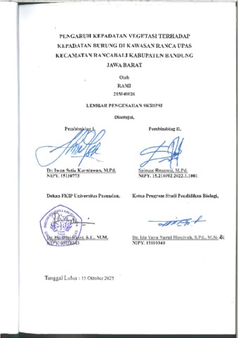 RAMI, 215040026 (2025) PENGARUH KEPADATAN VEGETASI TERHADAP KEPADATAN BURUNG DI KAWASAN RANCA UPAS KECAMATAN RANCABALI KABUPATEN BANDUNG JAWA BARAT. Skripsi(S1) thesis, FKIP UNPAS.