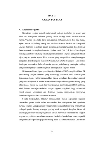 Indonesia merupakan salah satu negara dengan keanekaragaman burung tertinggi di dunia, namun keberadaan spesies burung kini menghadapi tekanan akibat deforestasi, perubahan tata guna lahan, dan aktivitas manusia lainnya. Kawasan Ranca Upas di Kabupaten Bandung merupakan salah satu kawasan wisata yang menyimpan keanekaragaman hayati tinggi, namun juga mengalami tekanan ekologi yang dapat memengaruhi kondisi vegetasi dan populasi burung. Penelitian ini bertujuan untuk mengkaji pengaruh kepadatan vegetasi terhadap kepadatan burung di kawasan Ranca Upas. Pengumpulan data dilakukan melalui metode point count untuk pengamatan burung dan petak kuadrat untuk pengamatan vegetasi, masingmasing pada sepuluh titik pengamatan. Analisis data dilakukan menggunakan uji regresi linear sederhana dan korelasi Pearson melalui SPSS. Hasil penelitian menunjukkan bahwa tingkat kepadatan vegetasi di Ranca Upas bervariasi antara 692,31–9.153,85 individu/ha, dengan nilai tertinggi pada Plot 5 dan terendah pada Plot 1. Kepadatan burung juga beragam, berkisar antara 530,72–1.734,02 individu/ha, menunjukkan habitat masih mendukung namun tidak merata. Hasil regresi linear menunjukkan nilai signifikansi 0,890 dengan R² = 0,003, yang berarti hanya 0,3% variasi kepadatan burung dijelaskan oleh kepadatan vegetasi, sedangkan faktor lain seperti jenis vegetasi, sumber pakan, dan gangguan manusia lebih berpengaruh. Temuan ini mengindikasikan bahwa faktor lain seperti struktur vertikal vegetasi, jenis tumbuhan, serta gangguan manusia memiliki pengaruh yang lebih besar terhadap variasi kepadatan burung. Oleh karena itu, disarankan agar penelitian lanjutan mempertimbangkan elemen-elemen ekologi yang lebih kompleks agar diperoleh pemahaman yang lebih menyeluruh mengenai preferensi habitat burung di kawasan konservasi. Kata kunci: burung, habitat, keanekaragaman hayati, kepadatan vegetasi, konservasi, Ranca Upas