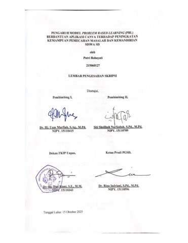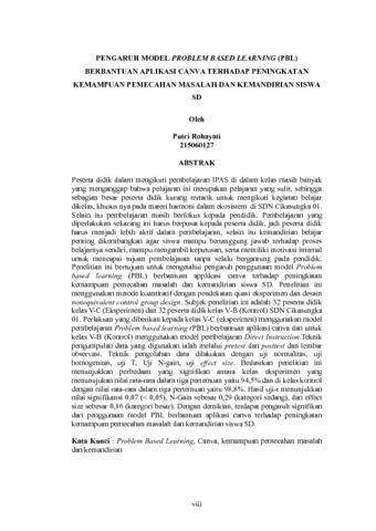 Rohayati,Putri, 215060127 (2025) PENGARUH MODEL PROBLEM BASED LEARNING (PBL) BERBANTUAN APLIKASI CANVA TERHADAP PENINGKATAN KEMAMPUAN PEMECAHAN MASALAH DAN KEMANDIRIAN SISWA SD (Penelitian Quasi Eksperimen Pada Siswa Kelas V Muatan Pelajaran IPAS Sekolah Dasar Negeri Cikasungka 01 Kabupaten Bandung). Skripsi(S1) thesis, FKIP UNPAS.