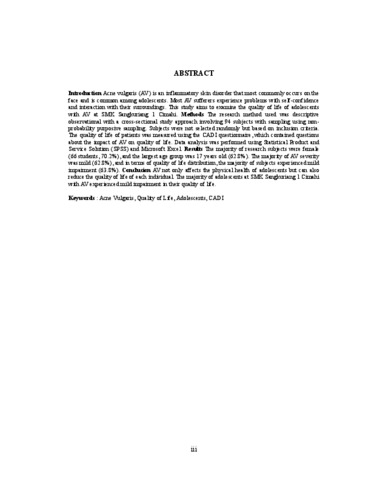 Ayuningtyas Lintang Rinesti, 220010008, Rinesti, Ayuningtyas Lintang 220010008 (2025) GAMBARAN KUALITAS HIDUP REMAJA DENGAN AKNE VULGARIS DI SEKOLAH MENENGAH KEJURUAN SANGKURIANG 1 CIMAHI TAHUN 2025. Skripsi(S1) thesis, UNIVERSITAS PASUNDAN.