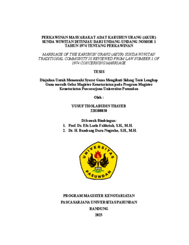 THOLABUDIN THAYEB, YUSUF (2025) PERKAWINAN MASYARAKAT ADAT KARUHUN URANG (AKUR) SUNDA WIWITAN DITINJAU DARI UNDANG-UNDANG NOMOR 1 TAHUN 1974 TENTANG PERKAWINAN MARRIAGE OF THE KARUHUN URANG (AKUR) SUNDA WIWITAN TRADITIONAL COMMUNITY IS REVIEWED FROM LAW NUMBER 1 OF 1974 CONCERNING MARRIAGE. Thesis(S2) thesis, UNIVERSITAS PASUNDAN.