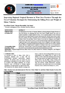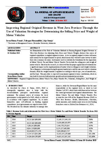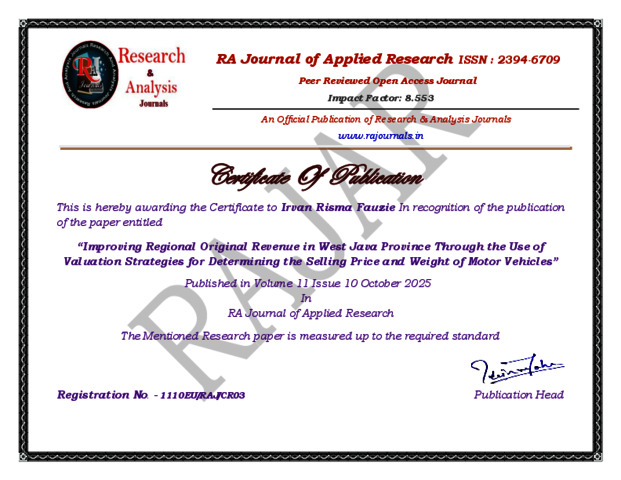Risma Fauzie, Irvan and Hasanuddin, Tubagus and Suteja, Jaja (2025) Improving Regional Original Revenue in West Java Province Through the Use of Valuation Strategies for Determining the Selling Price and Weight of Motor Vehicles. Disertasi(S3) thesis, UNIVERSITAS PASUNDAN.