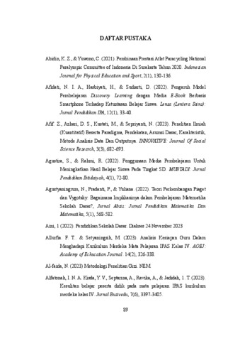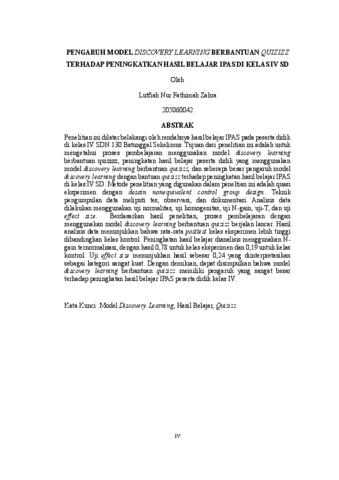 Penelitian ini dilatar belakangi oleh rendahnya hasil belajar IPAS pada peserta didik di kelas IV SDN 130 Batunggal Sekelimus. Tujuan dari penelitian ini adalah untuk mengetahui proses pembelajaran menggunakan model discovery learning berbantuan quizizz, peningkatan hasil belajar peserta didik yang menggunakan model discovery learning berbantuan quizizz, dan seberapa besar pengaruh model discovery learning dengan bantuan quizizz terhadap peningkatan hasil belajar IPAS di kelas IV SD. Metode penelitian yang digunakan dalam peneltian ini adalah quasi eksperimen dengan desain nonequivalent control group design. Teknik pengumpulan data meliputi tes, observasi, dan dokumentasi. Analisis data dilakukan menggunakan uji normalitas, uji homogenitas, uji N-gain, uji-T, dan uji effect size. Berdasarkan hasil penelitian, proses pembelajaran dengan menggunakan model discovery learning berbantuan quizizz berjalan lancar. Hasil analisis data menunjukkan bahwa rata-rata posttest kelas eksperimen lebih tinggi dibandingkan kelas kontrol. Peningkatan hasil belajar dianalisis menggunakan Ngain ternormalisasi, dengan hasil 0,78 untuk kelas eksperimen dan 0,19 untuk kelas kontrol. Uji effect size menunjukkan hasil sebesar 0,24 yang diinterpretasikan sebagai kategori sangat kuat. Dengan demikian, dapat disimpulkan bahwa model discovery learning berbantuan quizizz memiliki pengaruh yang sangat besar terhadap peningkatan hasil belajar IPAS peserta didik kelas IV. Kata Kunci: Model Discovery Learning, Hasil Belajar, Quizizz