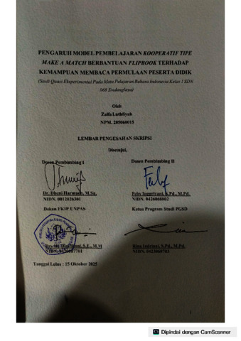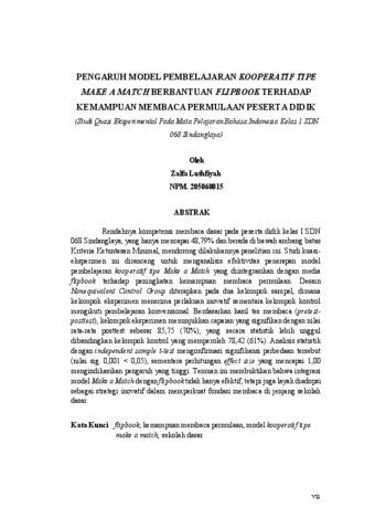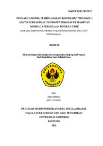 Luthfiyah Zalfa, 205060015 (2025) PENGARUH MODEL PEMBELAJARAN KOOPERATIF TIPE MAKE A MATCH BERBANTUAN FLIPBOOK TERHADAP KEMAMPUAN MEMBACA PERMULAAN PESERTA DIDIK (Studi Quasi Eksperimental Pada Mata Pelajaran Bahasa Indonesia Kelas 1 SDN 068 Sindanglaya). Skripsi(S1) thesis, FKIP UNPAS.