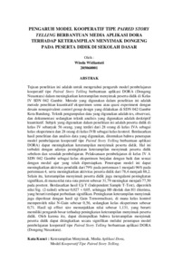 Tujuan penelitian ini adalah untuk mengetahui pengaruh model pembelajaran kooperatif tipe Paired Story Telling berbantuan aplikasi DORA (Dongeng Nusantara) dalam meningkatkan keterampilan menyimak peserta didik di Kelas IV SDN 042 Gambir. Metode yang digunakan dalam penelitian ini adalah metode penelitian kuantitatif eksperimen semu atau quasi experiment dengan desain nonequivalent control group design yang dilakukan di SDN 042 Gambir Kota Bandung. Teknik pengumpulan data yang digunakan adalah tes, observasi, dan dokumentasi sedangkan teknik analisis yang digunakan adalah deskriptif kuantitatif. Subjek yang digunakan dalam penelitian ini adalah peserta didik di kelas IV sebanyak 56 orang, yang terdiri dari 28 orang di kelas IVA sebagai kelas eksperimen dan 28 orang di kelas IVB sebagai kelas kontrol. Berdasarkan hasil penelitian dan analisis data yang digunakan, ditemukan bahwa penerapan model pembelajaran kooperatif tipe Paired Story Telling berbantuan aplikasi DORA) dapat meningkatkan keterampilan menyimak peserta didik. Hal ini terbukti dengan adanya peningkatan keterampilan menyimak peserta didik sebelum dan sesudah pembelajaran. Pelaksanaan pembelajaran di kelas IV A SDN 042 Gambir sebagai kelas eksperimen berjalan dengan baik dan sesuai dengan modul ajar yang telah dipersiapkan. Penerapan model ini dapat meningkatkan aktivitas pendidik dari 79% pada pertemuan 1 menjadi 96% pada pertemuan 4, serta meningkatkan aktivitas peserta didik dari 78,4 menjadi 88,2. Selain itu, keterampilan menyimak peserta didik juga mengalami peningkatan signifikan, di mana nilai rata-rata pretest sebesar 31,79 meningkat menjadi 77,50 pada posttest. Berdasarkan hasil Uji T (Independent Sample T-Test), diperoleh nilai Sig. (2-tailed) sebesar 0,027 < 0,05, sehingga H0 ditolak dan H1 diterima, yang berarti terdapat perbedaan signifikan. Peningkatan keterampilan menyimak juga diperkuat dengan hasil uji Gain Ternormalisasi, di mana kelas kontrol memperoleh nilai N-Gain sebesar 0,56, sedangkan kelas eksperimen sebesar 0,71. Hasil uji effect size menunjukkan nilai sebesar 1,131, yang berarti memiliki pengaruh besar terhadap peningkatan keterampilan menyimak peserta didik. Oleh karena itu, dapat disimpulkan bahwa keterampilan menyimak peserta didik dapat ditingkatkan secara signifikan melalui penerapan model pembelajaran kooperatif tipe Paired Story Telling berbantuan aplikasi DORA (Dongeng Nusantara). Kata Kunci : Keterampilan Menyimak, Media Aplikasi Dora, Model Kooperatif Tipe Paired Story Telling