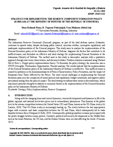 Rahmad Putra, Dony STRATEGY FOR IMPLEMENTING THE RESERVE COMPONENT FORMATION POLICY (KOMCAD) AT THE MINISTRY OF DEFENSE OF THE REPUBLIC OF INDONESIA. egueta. Anuario de la Facultad de Geografía e Historia 25 (2), 2025. ISSN eISSN: 2341-1112