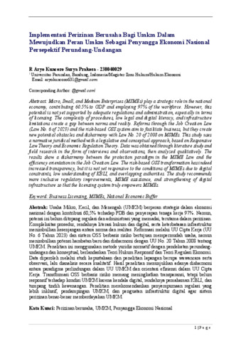 Kuncoro Surya Prakosa, Aryo (2026) Implementasi Perizinan Berusaha Bagi Umkm Dalam Mewujudkan Peran Umkm Sebagai Penyangga Ekonomi Nasional Persepektif Perundang-Undangan. (Submitted)