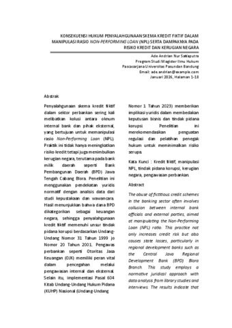 Andrian Nur Satiaputra, Ade (2026) KONSEKUENSI HUKUM PENYALAHGUNAAN SKEMA KREDIT FIKTIF DALAM MANIPULASI RASIO NON-PERFORMING LOAN (NPL) SERTA DAMPAKNYA PADA RISIKO KREDIT DAN KERUGIAN NEGARA. Thesis(S2) thesis, UNIVERSITAS PASUNDAN.