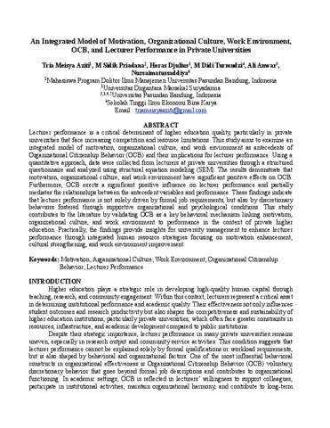 Meisya Aziti, Tria (2026) An Integrated Model of Motivation, Organizational Culture, Work Environment, OCB, and Lecturer Performance in Private Universities. Disertasi(S3) thesis, UNIVERSITAS PASUNDAN.