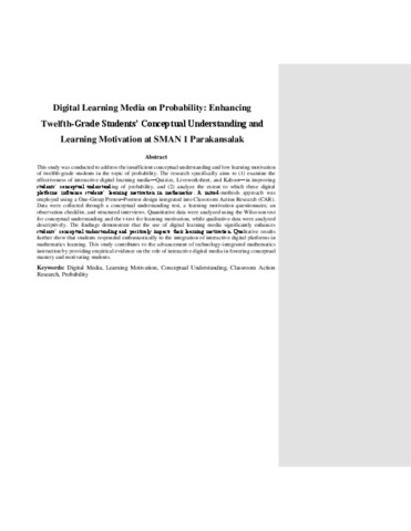 FIQRI, HASAN Digital Learning Media on Probability: Enhancing Twelfth-Grade Students’ Conceptual Understanding and Learning Motivation at SMAN 1 Parakansalak. (Submitted)