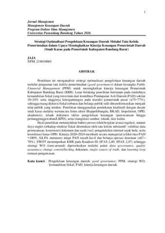 JAJA (2026) Strategi Optimalisasi Pengelolaan Keuangan Daerah Melalui Tata Kelola Pemerintahan dalam Upaya Meningkatkan Kinerja Keuangan Pemerintah Daerah (Studi Kasus pada Pemerintah Kabupaten Bandung Barat). Disertasi(S3) thesis, UNIVERSITAS PASUNDAN.