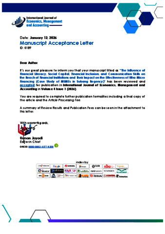 DAMAYANTI RUSMANA, FENNY (2026) The Influence of Financial Literacy, Social Capital, Financial Inclusion, and Communication Skills on the Reach of Financial Institutions and Their Impact on the Effectiveness of Ultra Micro Financing (Case Study of MSMEs in Subang Regency. International Journal of Economics, Management and Accounting in Volume 4 Issue 1 (2026)., Volume (0189). (Unpublished)